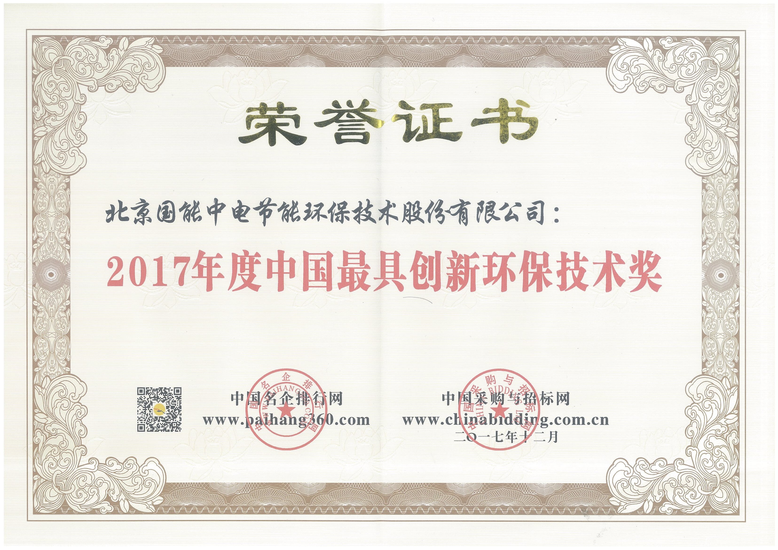 2017年度中國最具創(chuàng)新環(huán)保技術獎