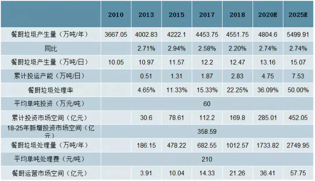 2025年全國餐廚垃圾產能有望達到7.53萬噸/日。餐廚垃圾產量方面:按照城鎮人口每人每天0.15kg餐廚垃圾產量進行計算,全國餐廚垃圾產量從2010年的3667萬噸提升至2018年的4552萬噸,復合增速達2.74%,按此增速推算,2025年全國餐廚垃圾產量有望達到5500萬噸。餐廚垃圾產能方面:2013年全國餐廚垃圾處理能力0.51萬噸/日,截至2017年10月,全國已形成1.87萬噸/日的餐廚垃圾處理能力,復合增速達40.35%。然而截至十二五期末,全國的餐廚垃圾處理產能為1.31萬噸/日,占十二五政策規劃要求的43.38%,假設十三五期間新增3.44萬噸/日的產能規劃目標能夠全額完成,則2020年全國餐廚垃圾處理產能有望達到4.75萬噸/日,餐廚垃圾資源利用率有望達到36.09%。對標海外發達國家,據統計2005年起韓國全國的填埋場均不再處理餐廚垃圾,餐廚垃圾循環利用率達到90%;法國對餐廚垃圾進行強制分類,餐廚廢油循環利用率超過40%且逐漸上升;英國計劃到2025年將餐廚垃圾循環利用率提高到70%。假設我國2025年餐廚垃圾利用率達到50%,則2025年我國餐廚垃圾產能有望達到7.53萬噸/日,年運營處理規模有望達到2749.95萬噸。
